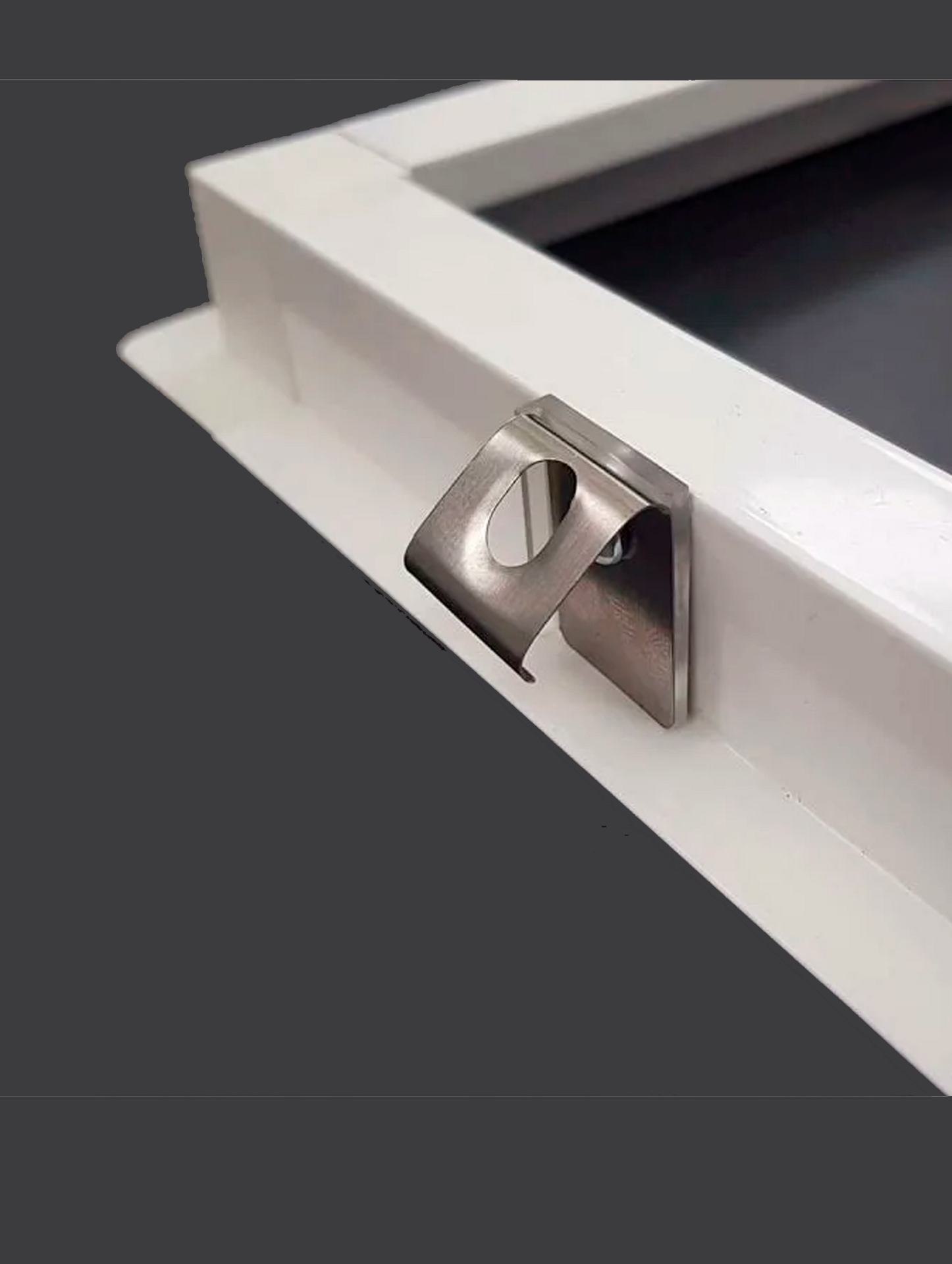 При производстве используем прочный алюминиевый профиль 160г/м, литой усиленный уголок с суперпрочного ABS пластика, надежно фиксируем импост
